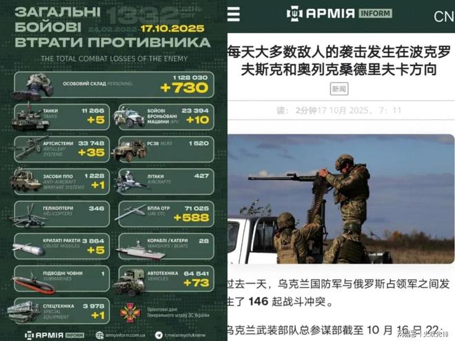今天是俄乌战争第1332天。乌克兰总参谋部发布了有关冲突的最新报告。此前一天,俄罗斯和乌克兰军队共进行了146次交火。乌克兰武装部队当天消灭了730名敌人。苏梅-乌克兰军队向奥列克谢耶夫卡挺进。俄罗斯媒体报道称,奥列克谢耶夫卡已基本失踪。乌克兰军队进入中心,控制了南部地区……俄军援军大部分在到达前线之前就被无人机消灭了……在利曼的指挥下,从正面攻击扎里奇尼的俄军被击溃。大批俄军在谢列布良斯克森林“消失”(故意关闭通讯以“失去联系”)。乌克兰陆军总参谋部10月16日通报,在波克罗夫斯克以北的多布罗皮利亚行动中,乌军从俄罗斯领土收复了182.8平方公里的土地。我又移除了230.1平方公里。乌克兰控制区平方公里范围内的俄罗斯渗透者……在2025年8月21日开始的反击中,乌克兰军队损失了至少13945名俄军,其中8402人当场死亡,5419人受伤,124人被俘。注意俄军在这个方向的随意比例。死亡人数高于受伤和被俘人数。在多布罗皮利亚的指挥下,俄军于10月16日再次出动22辆坦克/装甲车,试图攻击沙霍夫和沃洛基米里夫卡两个定居点……乌克兰炮兵和无人机配合,共摧毁了9辆坦克/装甲车,击毁了其中4辆攻击的坦克,有效瓦解了俄军的攻势。在扎波罗热方向,“俄罗斯新闻”宣传员伊万·祖耶夫在执行宣传任务时被枪杀,另一名宣传员尤里·沃伊特科维奇受重伤。新的武器乌克兰军队已部署在黑海边缘。许多悍马车都配备了新型“吸血鬼”火箭系统。这种额外费用的防空系统可以发射APKWS火箭来击落无人机和巡航导弹。乌克兰与美国联合研制的新型“阿耳忒弥斯”ALM-20无人机已完成测试。该无人机配备人工智能制导系统,可携带45公斤高爆弹头,射程1600公里。它被认为是“见证”无人机中的高科技标杆产品,很快将安装在乌克兰军队、阿莱姆赫和美国。乌克兰总参谋部发布战报:乌克兰国防军在库尔斯克地区击中了俄军伊斯坎德尔导弹营的雷达综合体和一辆装载车。凌晨,乌兹别克斯坦无人机袭击了俄罗斯萨拉托夫的能源设施。市内发生多起爆炸,并引发火灾工业区……该州恩格斯空军基地也在凌晨3点50分至5点20分之间遭到袭击,机场关闭。当地时间16日,乌克兰国家电力公司宣布,由于国家电力系统形势复杂,全国实施紧急停电。此外,将于当地时间10月17日对工业设施实施限电。强迫移民与俄罗斯16日对乌克兰的大规模军事袭击有关。在当天的袭击中,俄罗斯军方动用了320架无人机和37枚导弹袭击了乌克兰多个电力基础设施,造成大面积停电。俄罗斯的持续攻击可能会彻底瘫痪乌克兰的电力机构给军事工业?答案是否定的。乌克兰地下蕴藏着大量天然气。欧盟、北约等帮助乌克兰的国家也恢复了乌克兰的电力和其他基础设施及时调整结构。至于严重损害乌克兰的军工,那就更不可能了。乌克兰的军工体系一半在地下,一半在国外(其他北约国家)。冷战期间,基辅作为北约与华约对抗的桥梁多次得到加强。整个城市拥有500个超大型地下掩体和6000个通风设施齐全的避难所。全部按照核防爆标准建造。钢筋混凝土的厚度为3米,常规导弹/炸弹无法造成任何伤害……俄罗斯的袭击之所以能够造成平民伤亡,是因为袭击大多发生在半夜,人们正在睡觉,未能进入掩体。相反,俄罗斯大国土面积、深度和广度战略的优势却成为其劣势。它没有太多的防空部队或先进防空系统系统。如果轰炸持续足够长的时间,俄罗斯将首先倒下。作为回应,乌克兰立即于今天凌晨对俄罗斯本土发起暴力报复。俄罗斯网络媒体Astra报道称,库尔斯克地区里尔斯克市40%的地区因乌克兰无人机袭击而断电。别尔哥罗德州瓦鲁斯基区三分之一的人口因袭击而断电。由于乌克兰无人机袭击,伏尔加格勒和沃罗涅日的许多地区陷入黑暗。俄罗斯占领的克里米亚举行了“烛光守夜”活动。此外,俄罗斯《生意人报》报道称,莫斯科、索契、罗斯托夫-萨拉托夫等州十多个机场因乌克兰无人机袭击而暂时关闭。乌克兰总统泽连斯基昨天签署法令,任命奥尔哈·列舍蒂洛娃(科比林斯卡)为军事监察员。至此,列舍季洛娃成为乌克兰历史上第一位军事观察员。当地时间10月16日,欧盟外交与防务委员卡拉斯、欧盟委员会副主席维尔库宁和防长库贝柳斯共同召开新闻发布会,公布了名为“欧盟2030年防务准备路线图”的防务计划草案。该路线图列出了当前的四项旗舰防御举措,即“欧洲无人机墙”、“东翼监控”、“防空盾牌”和“太空防御盾牌”。这四项防务计划的完成,从根本上摆脱了欧洲对美国的安全依赖。欧盟委员会表示:这些计划将增强欧洲在陆地、空中、海上、网络和太空方面的威慑和防御能力。路线图的完成也意味着欧洲在2035年之前要投资6.8万亿欧元,这是一笔巨大的国防开支……该草案当天获得欧盟委员会批准,计划在本月23日的欧盟峰会上提交给成员国。感谢您的阅读,欢迎来到留下宝贵意见
