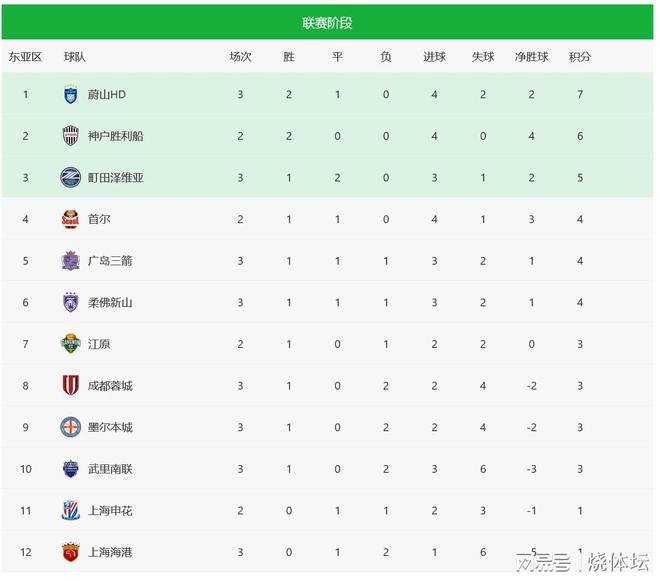 亚冠积分榜:上海黑格1平2负排名垫底。中超排名